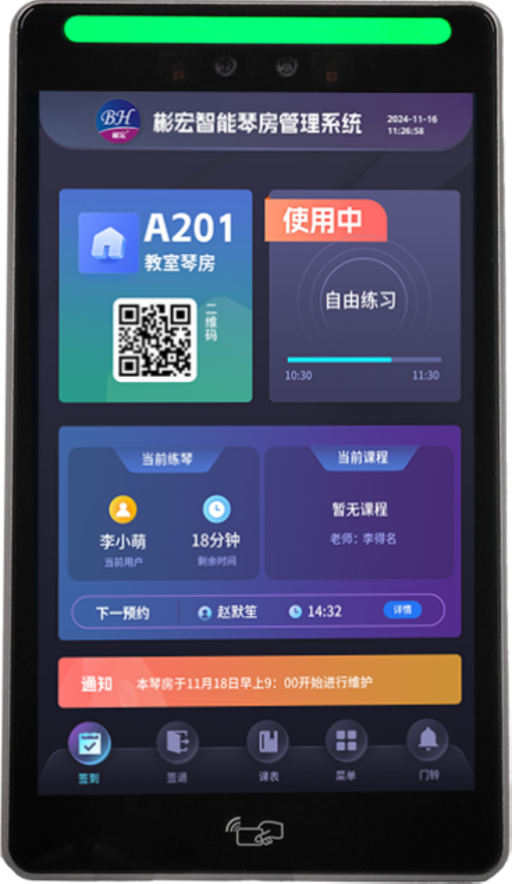 实时展示琴房当前使用状态,提升琴房整体对外形象展示,为师生、领导给予最新的数据展示(支持定制化展示)